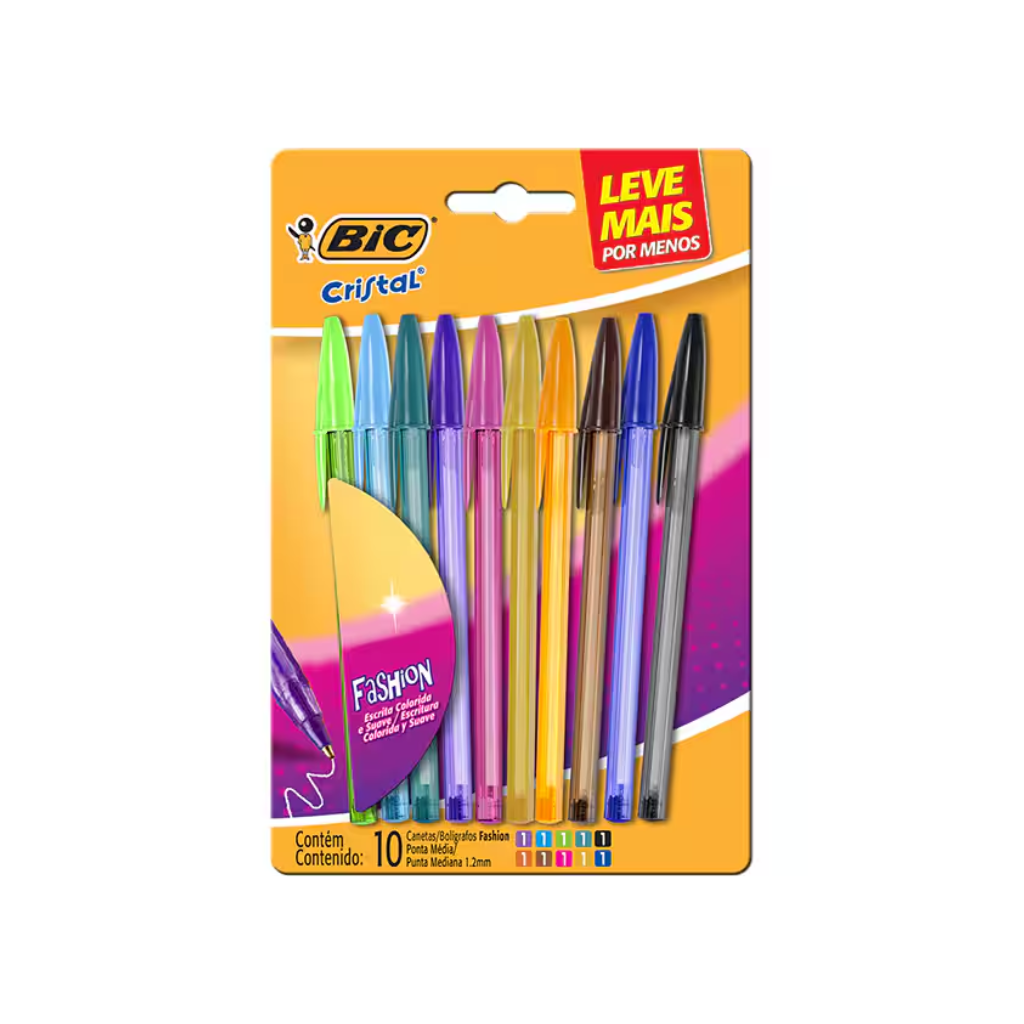 A Caneta Esferográfica BIC da linha Cristal Fashion possui escrita média e vem em uma cartela com 10 cores vivas como preto, azul, azul-turquesa, verde-claro, verde-escuro, roxa, rosa, laranja, dourado e marrom.